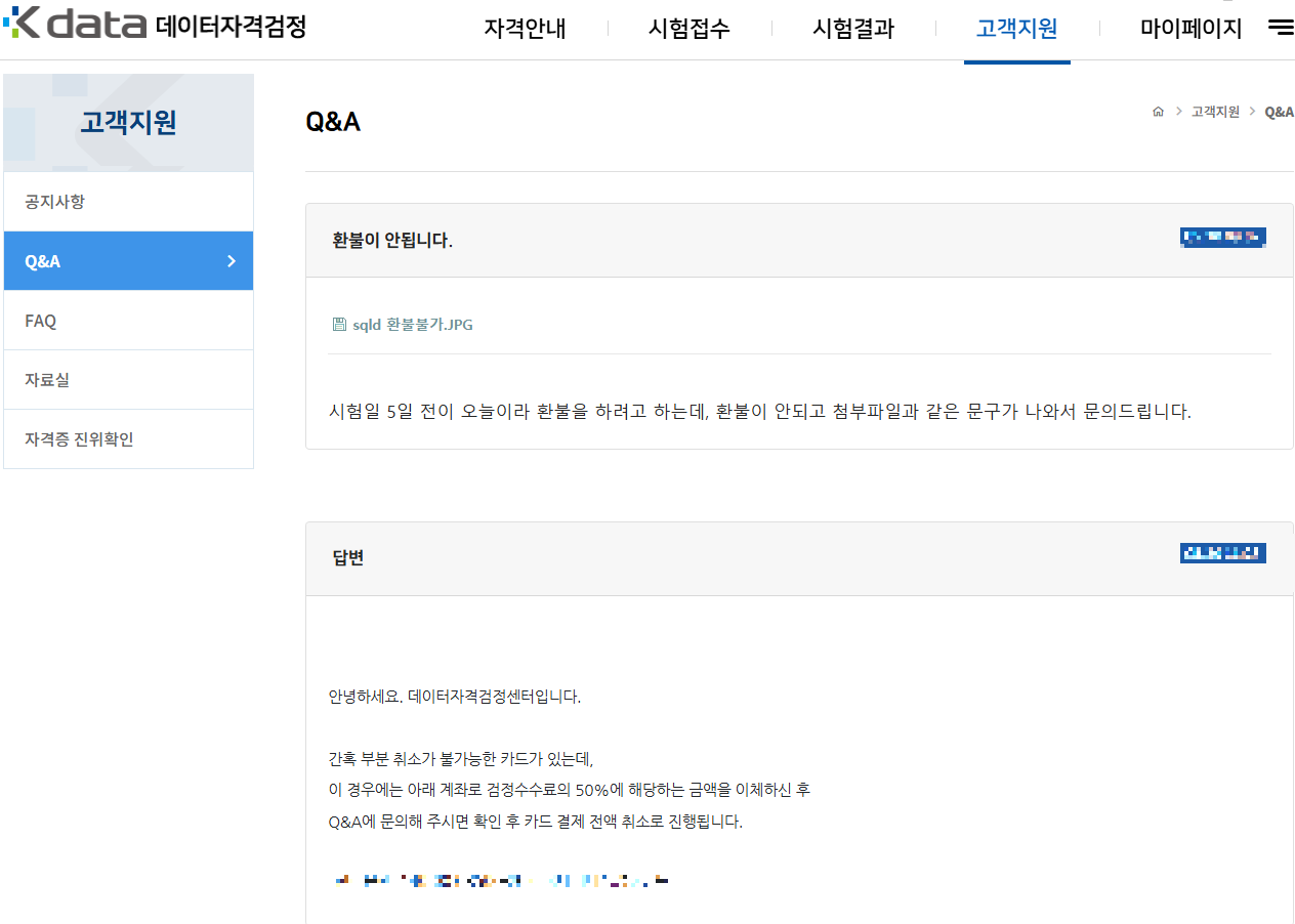 데이터자격검정 환불과정 중에 "부분 매입취소 불가 취소가능 금액 부족"이라는 메시지만 뜨고 환불이 제대로 진행되지 않는 경험하신 분들 있으실 텐데요.