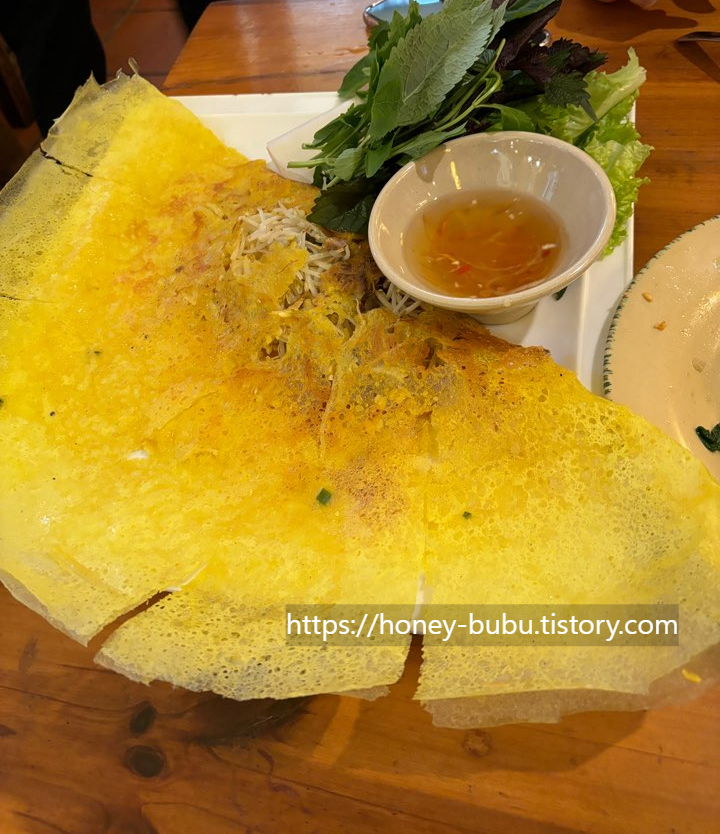 메뉴는 늘 시키던 모닝글로리를 주문했고, 반쎄오 맛집이라고 해서 주문했는데 멧 레스토랑에 비하면 먹기도 불편하고 맛도 그저 그랬어요.