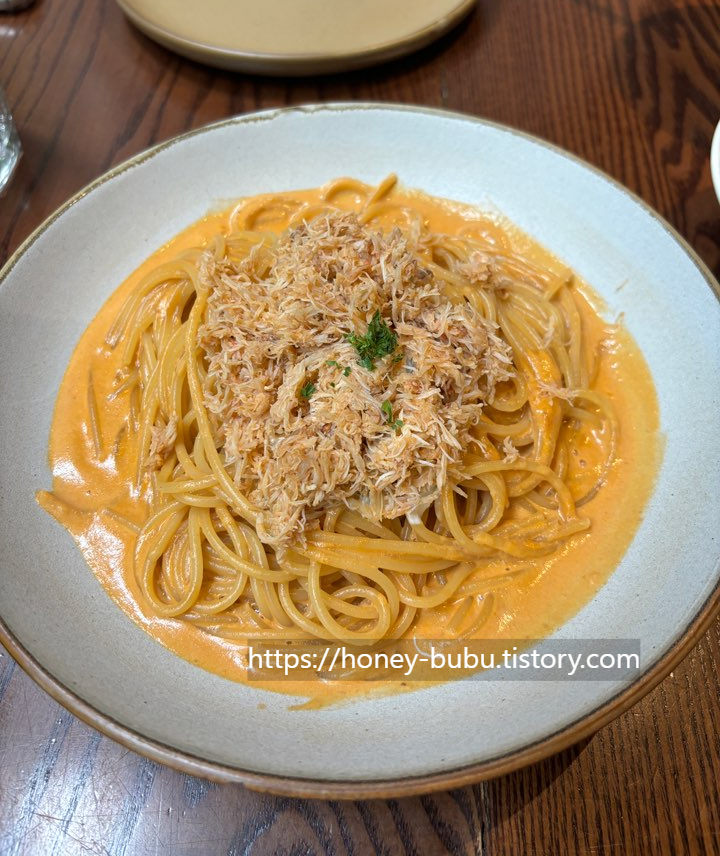 다음으로는 게살이 들어간 마스타를 시켰는데, 게살이 듬뿍 올라가 있는 거 보이시나요?